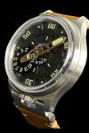 The scratch-resistant flat vintage top hat shaped sapphire crystal with underside anti-reflective coating protects the amazing multi-layer sandwich dial with a black hour disc and markers filled with Swiss Super-LumiNova. The gold color minute hand is also filled with Swiss Super-LumiNova.