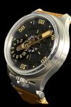 The scratch-resistant flat vintage top hat shaped sapphire crystal with underside anti-reflective coating protects the amazing multi-layer sandwich dial with a black hour disc and markers filled with Swiss Super-LumiNova. The gold color minute hand is also filled with Swiss Super-LumiNova.
