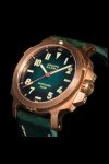 The Vanguard features a brushed 316L stainless steel or CuSn8 bronze case with a large screw-lock signed crown protected by bolt-on crown guards. A bolt-on bronze case side guard is also incorporated into the left side of the case. The water resistant rating is 200 metres or 20 atmos.